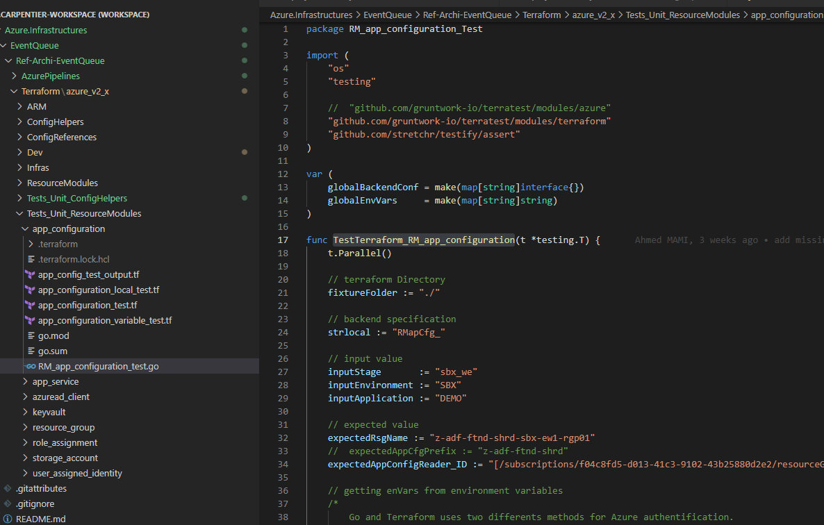 我在(例如) Terraform\azure_v2_X\ResourceModules子目录中有terraform代码,在Terraform\azure_v2_X\ResourceModules子目录中有terratest测试(在app_configuration resourceModules的屏幕截图app_configuration测试中)。