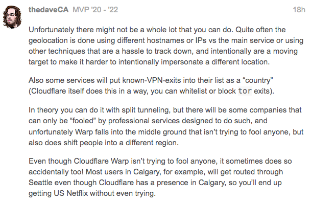 我住在加拿大,而且我访问的某些网站要求我在加拿大,如果他们认为我不在,就封锁我的访问。因为我的IPv6地址是地理定位到美国,我不得不断开和重新连接云彩曲,以访问这个网站。