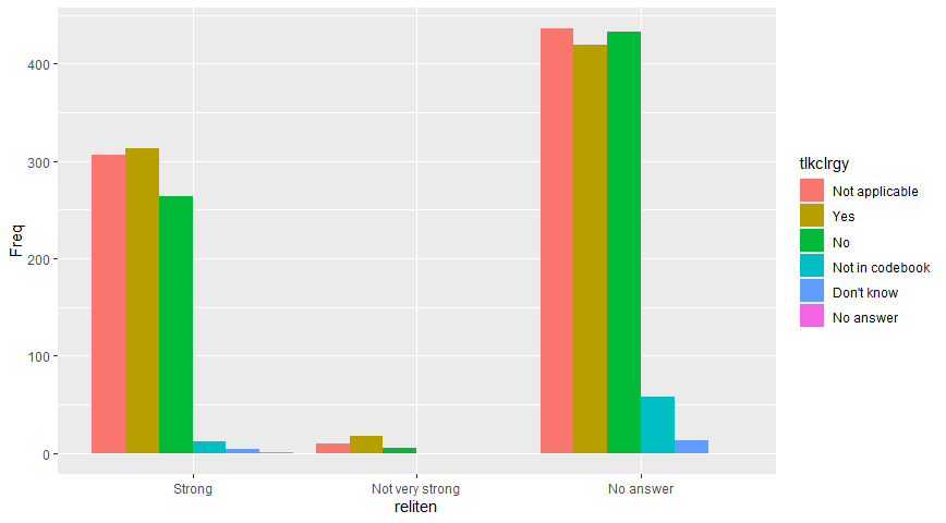 我刚开始在R,我正试图把我的头脑围绕着酒吧,为大学的任务。具体来说,我正在使用2018年通用社会调查数据集(代码本:https://www.thearda.com/Archive/Files/Codebooks/GSS2018_CB.asp),我试图弄清楚宗教对人们寻求心理健康帮助的方式是否有任何影响。我想用reliten (宗教性的自我评估-从强烈到没有宗教)作为IV和tlkclrgy (询问一个有心理健康问题的人是否应该接触宗教领袖--是或不是)作为DV。为了更好地可视化数据,我想在x轴上创建一个与reliten并排的条形图,看看有多少人在tlkclrgy上回答是和否。我的问题是,在酒吧里,我得到的是数字,而不是类别(从强烈到没有宗教信仰)。这是我试过的,但我一直在x轴上得到NA: