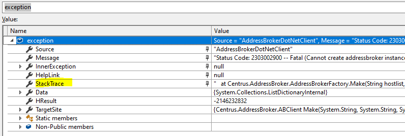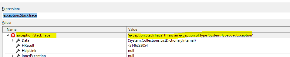 异常对象在调试模式(包括堆栈跟踪详细信息)中查看时具有所有详细信息。只有在记录器试图读取堆栈跟踪信息时才在异常以下。