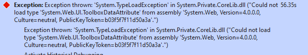 在catch块中获取TypeLoadException (如第一个屏幕截图所示)