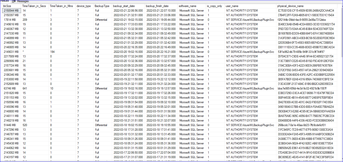 我已经为Server上的一个数据库附上了备份历史的屏幕截图。一个正常的完全备份,周日晚上7:00运行,大约需要200分钟,而在晚上7:00运行其他6天的不同备份大约需要8-10分钟。