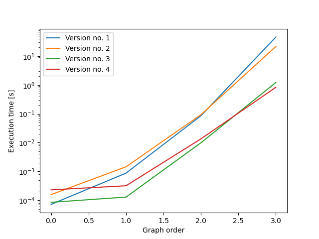 在第二个变体(以下版本3)中,批处理中的所有图都有相同的出度序列。这将大大提高运行时间(对于大小为4的图形,运行速度是4的35倍,而对于较大的图,则提高了更大的速度)。