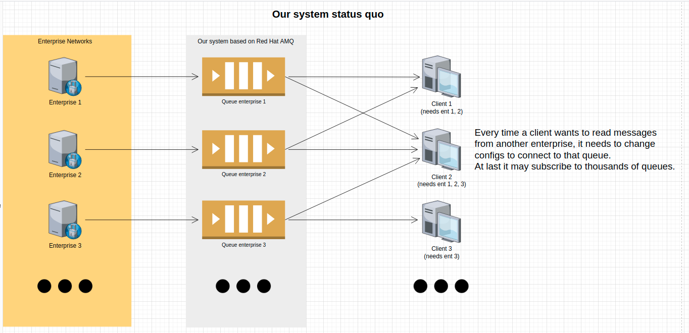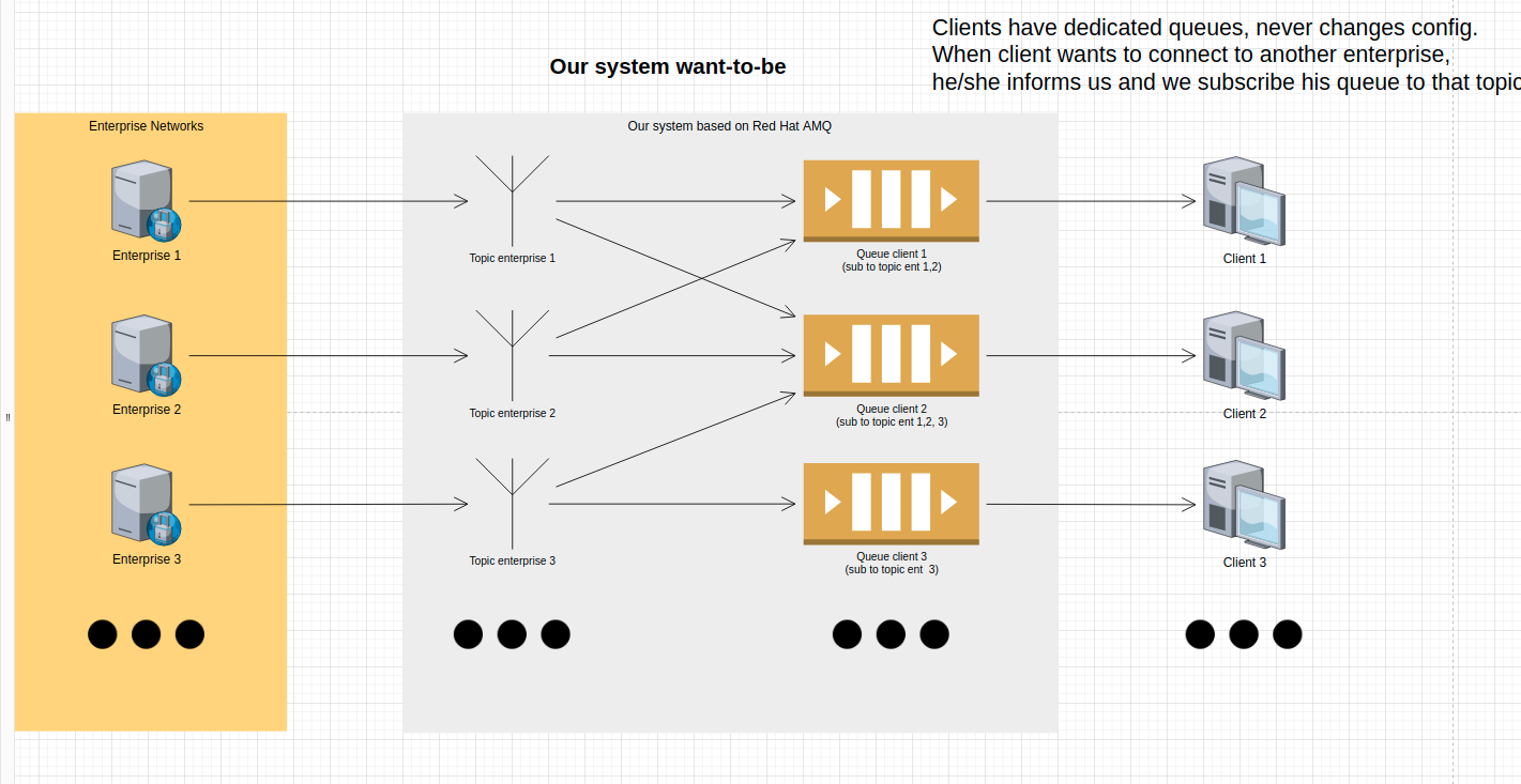 理想的解决方案是,他/她只连接到他/她的队列(目标队列),当他想订阅另一个源队列时,向我们发送一个请求,我们将他/她的目标队列内部连接到他/她需要的那个源队列,因此他不需要做任何配置更改。在Red 6中是否有一些本地的方法来完成从主题到队列的消息编排?(当然,我们需要一个API来处理这类请求)