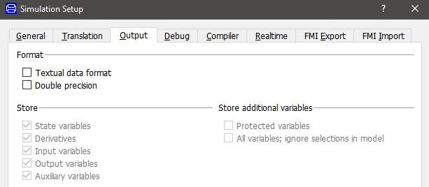 我在Dymola2021x中运行了一批模拟,在输出方面,我只关心一些状态变量。我认为限制选择的最简单方法是进入模拟Setup>Output>Store,只选中“状态变量”框。但是所有的选项都是灰色的,所以我不能限制输出。