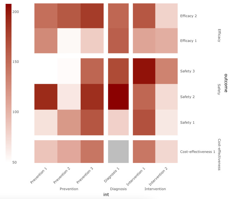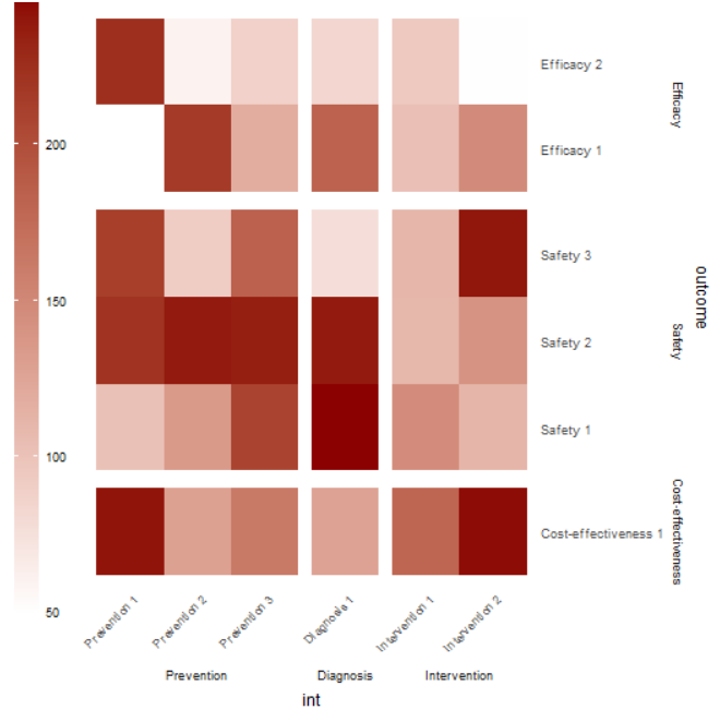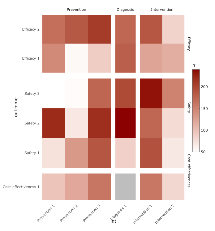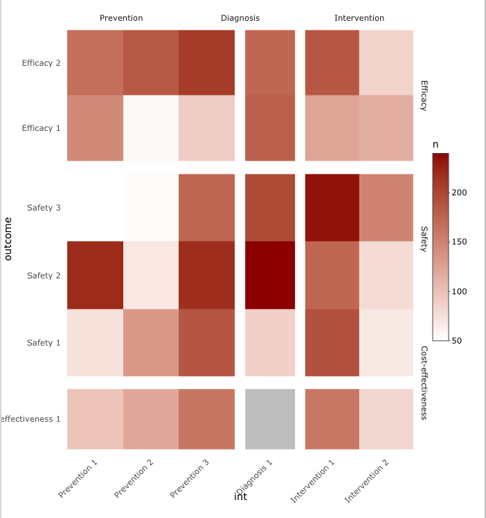 df$group.outcome <- factor(df$group.outcome, levels = c("Efficacy", "Safety", "Cost-effectiveness"))我想要基于变量outcome与int建立一个热图,使用n作为每个热映射单元格的填充。以下是所需的情节: