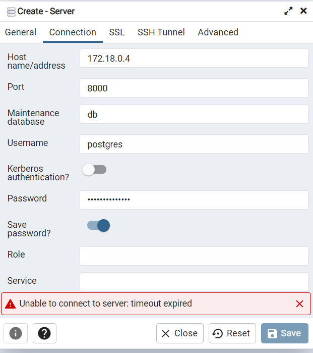 我尝试使用pgadmin4连接本地postgres,但是unable to connect to server: timeout expired失败了。我的服务器正在运行,在连接到pgadmin4中的服务器时,我使用了与docker-come.yml文件中提到的相同的属性。