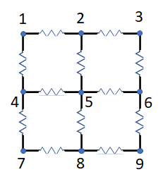 举个例子,这里有9个节点,12个电阻器。16 (4x4),25 (5x5),36 (6x6)节点有多少个电阻器?