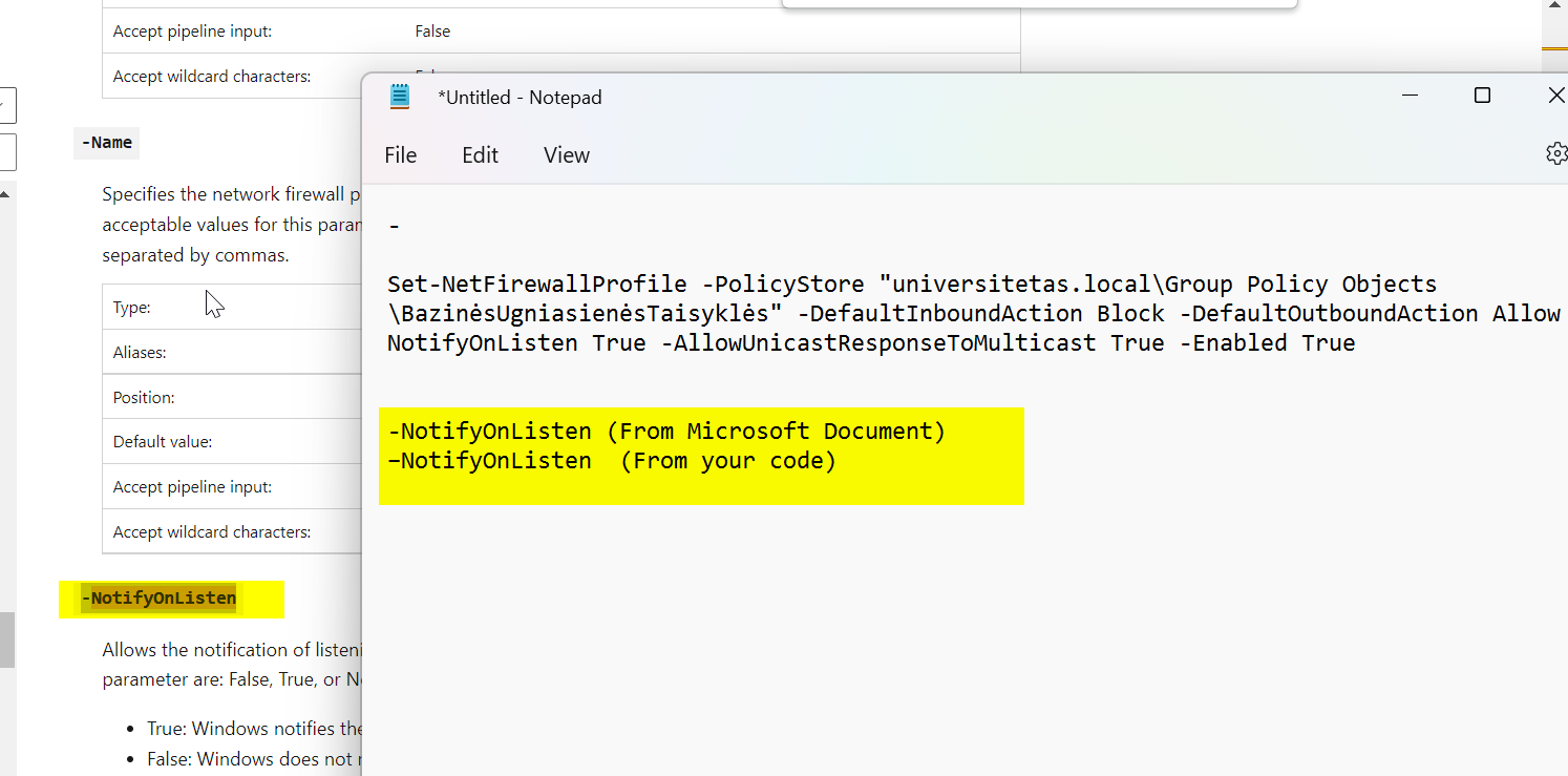 Set-NetFirewallProfile -PolicyStore "universitetas.local\Group Policy Objects\BazinėsUgniasienėsTaisyklės" -DefaultInboundAction Block -DefaultOutboundAction Allow –NotifyOnListen True -AllowUnicastResponseToMulticast True -Enabled True但这给了我一个错误..。