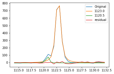 params=model.make_params(center=1123.0, amplitude=1000, sigma=0.27)