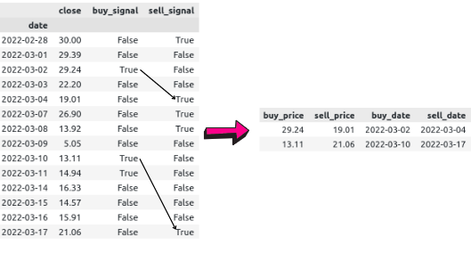 我有一个DataFrame,它有收盘价和金融资产的买卖信号。我的目标是创建一个新的数据,与对买卖天。