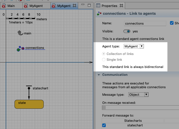 我正试图连接AnyLogic中的两个代理,以建立基于代理的模型。有人能告诉我怎么做吗?