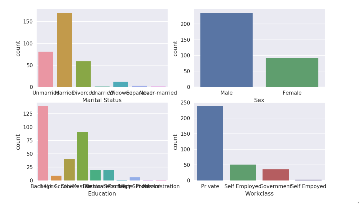 sns.countplot(x="Workclass", data=df, ax=axes[1,1])显示的可视化如下: