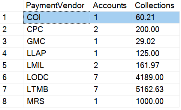 SELECT t.PaymentVendor, COUNT(t.AccountId) AS Accounts, SUM(t.TransactionAmount * -1) AS Collections