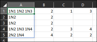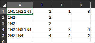=TEXTJOIN(" ",,LET(X,SEQUENCE(4),Y,COUNTIF(B1:D1,X),FILTER(Y&"N"&X,Y)))或者,如果您想在整个范围内一次性执行此操作: