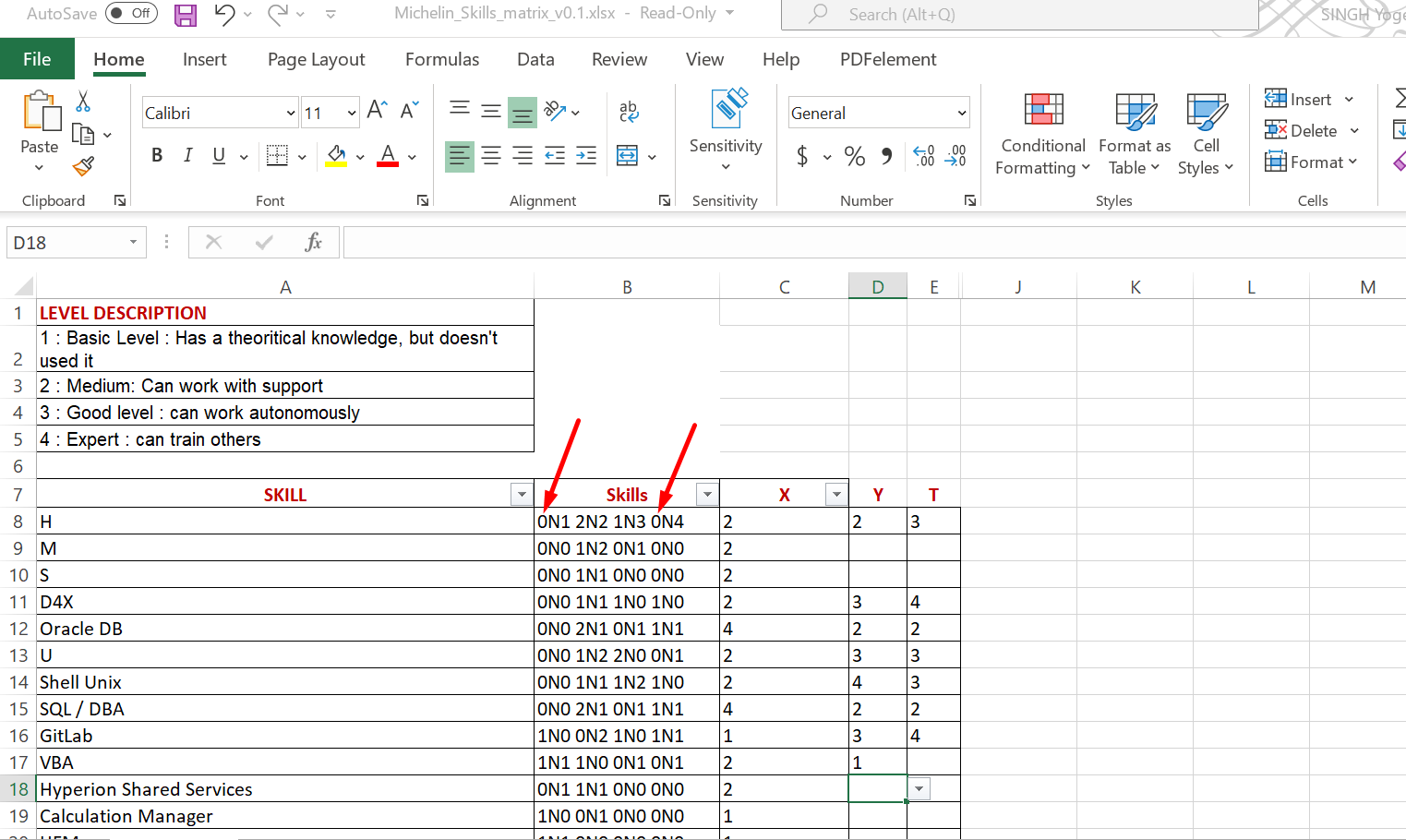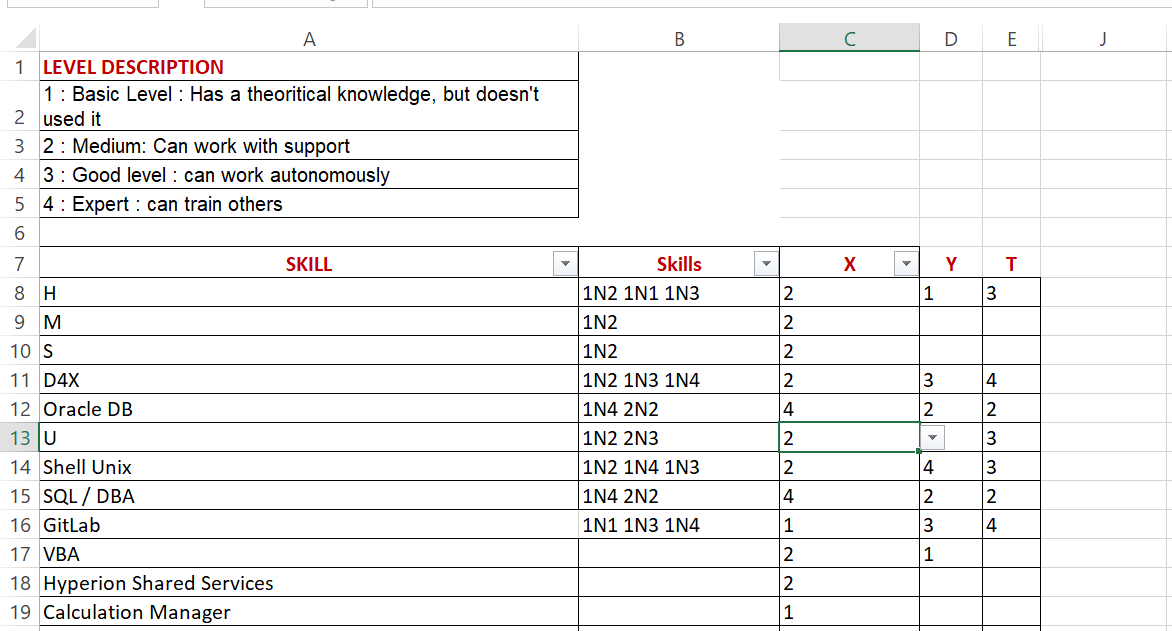 我想把数字,如1N4类型的文字,在方框中,这将表明1人有4级技能。例如,在第16行中,1N1表示1个人的技能1,1N3代表1人有skill3,1N4代表1人有技能4。