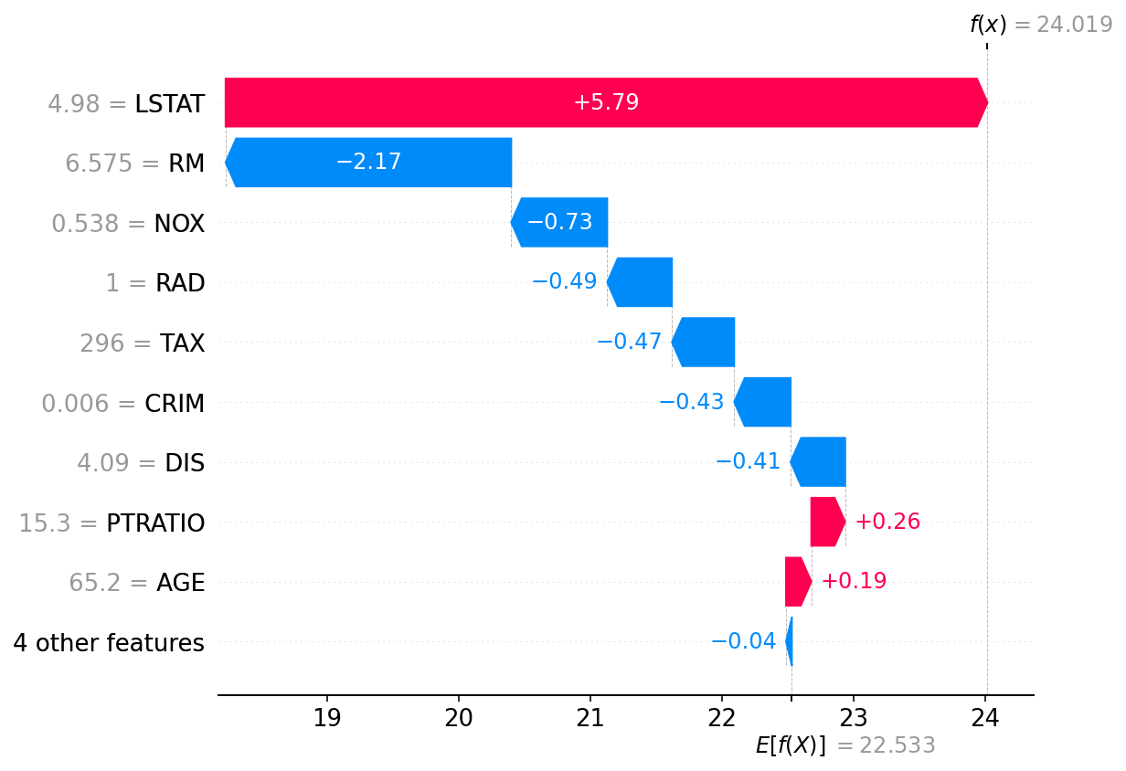 在为数据点从解释器中获取shap值之后,可以使用瀑布地块查看不同的特性对决策的贡献。