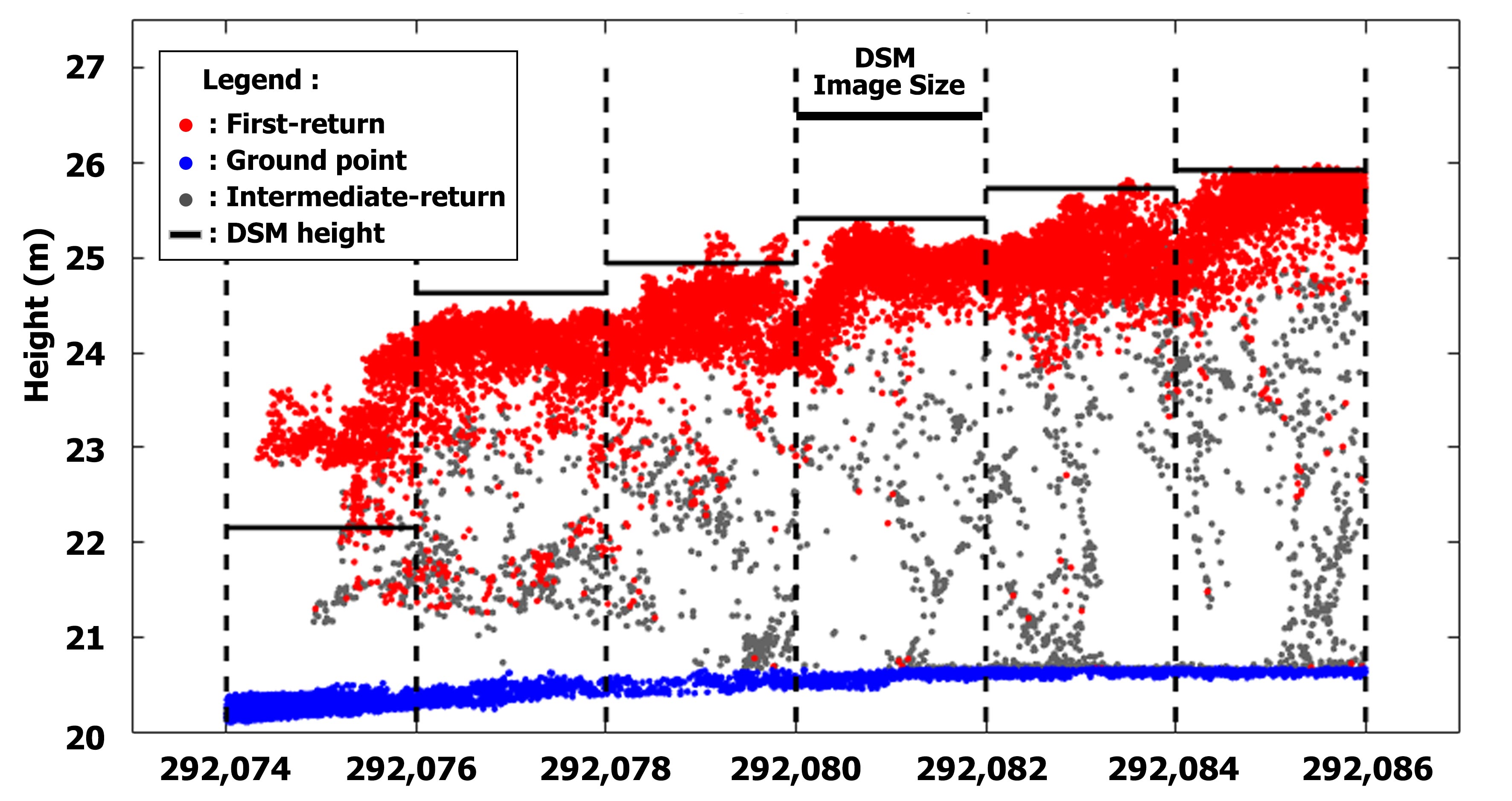 关于LidR中使用的TIN方法,我有一个问题。我的点云数据看起来像这个数字。用TIN法计算DSM时,高度值不是第一次返回的最高峰值。三角剖分中使用的值是一个像素内几个第一次返回的平均值吗?是否有任何方法可以使用LidR或其他软件从最高的第一次返回中检索DSM?谢谢。