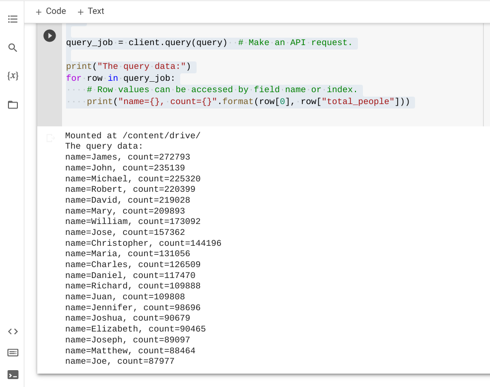 print("name={}, count={}".format(row[0], row["total_people"]))下面是在Google中执行上述示例代码的结果: