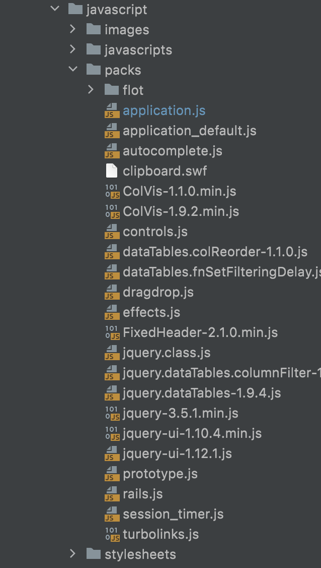 <%= javascript_pack_tag 'application', 'jquery-3', 'jquery-ui-1', 'jquery', 'FixedHeader-2', 'ColVis-1', 'rails': 'reload' %>