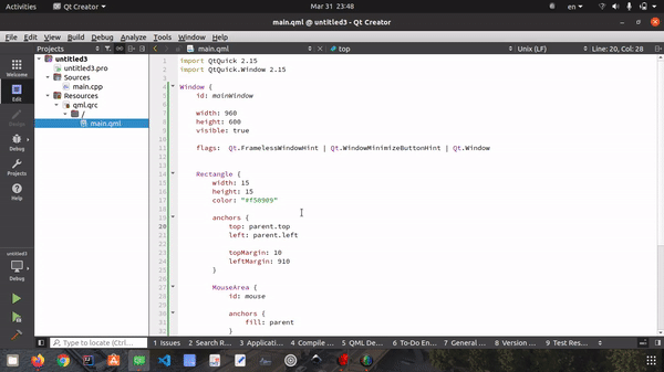 }我遇到了Qt.FramelessWindowHint的问题。在使用showMinimized()函数之后,我将恢复窗口,但是任何单击窗口都会再次导致窗口最小化。mouseArea从来不受压力。我试着把计时器打印的mouse.pressed值--而且一直都是假的。我找到了关于这个问题的几个链接,但是除了在恢复窗口时使用全屏之外,没有其他解决方案。我的应用程序总是保持相同的大小,永远不会转到全屏。