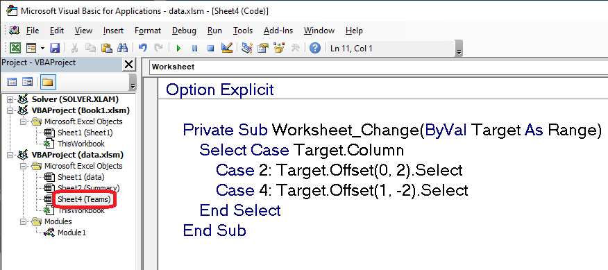 Case 4: Target.Offset(1, -2).Select