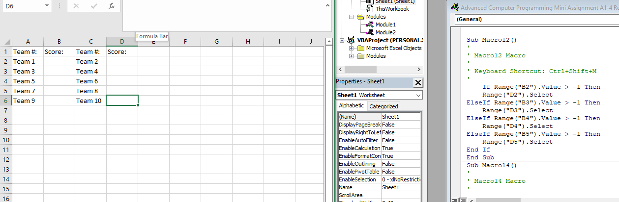 我刚开始使用excel宏编辑。我的扩展表是基于输入团队成绩的。我有四栏。A和C列是队#的分数,B和D列是他们的分数。所以我想按下单元格B2中的enter键,而不是下到B3,它向右转到D2。在去了D2之后,去了B3。我有4排队伍,所以它一直延续到D6。我试过使用宏,但没有成功。