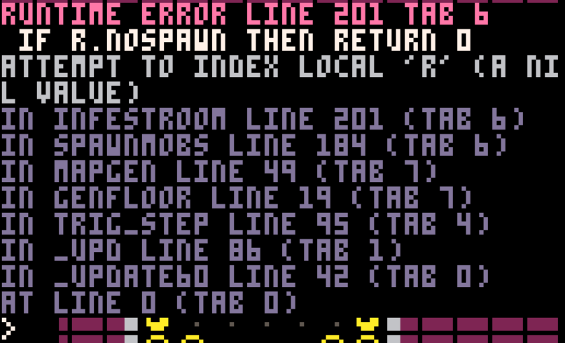 --Attempt to index local "R" (a nil value)我问皮科-8不和服务器,他们试图帮助我,但我仍然不完全理解,我不想纠缠他们更多的问题。我在PICO-8上的文件名叫Rogue -如果这与问题有关的话。
