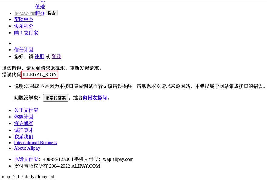 我一直在尝试与Adyen整合,并在一些支付方法上取得了成功,比如用餐者、JCB、银联。然而对于支付宝,我已经得到了这个ILLEGAL_SIGN符号错误,我找不到与此相关的文档中的任何内容。按照以下文档:https://docs.adyen.com/payment-methods/alipay/api-only,在/payments调用时,Adyen将返回一个url。在转到这个url之后,会显示一个带有ILLEGAL_SIGN错误的页面。是什么导致了这一切?