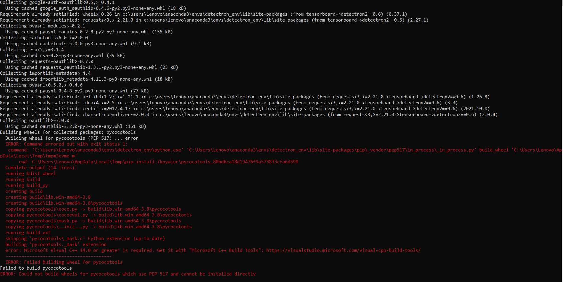 ERROR: Could not build wheels for pycocotools which use PEP 517 and cannot be installed directly**这就是它作为一个图像的样子。