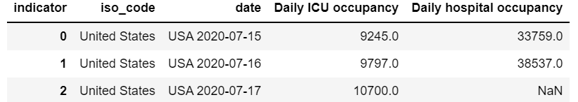 4 127430 United States USA 2020-07-17 Daily ICU occupancy 10700.0df = df.pivot(index=['iso_code', 'date'], columns='indicator', values='value').reset_index().reset_index(drop=True)