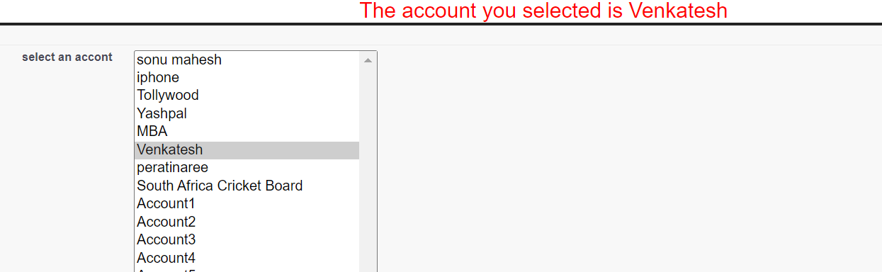 我试图将所有帐户显示为visualforce页面中的选择列表,当我从选中列表中选择任何选项时,选择列表必须折叠,并且我选择的选项必须显示在下面,而不是选择列表代码。