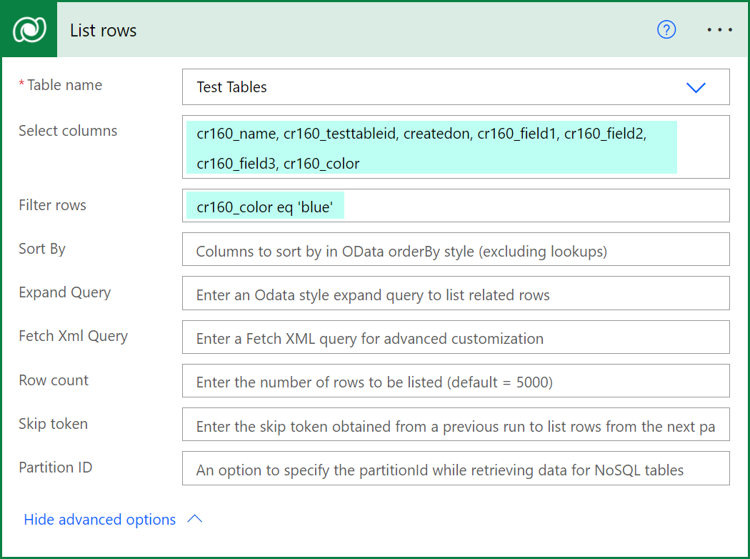 现在,在我的流程中,我添加了Dataverse ->列表行操作。具体来说,我已经将数据过滤到了cr160_color列中,用于蓝色值,这是您想要根据您的场景进行的。