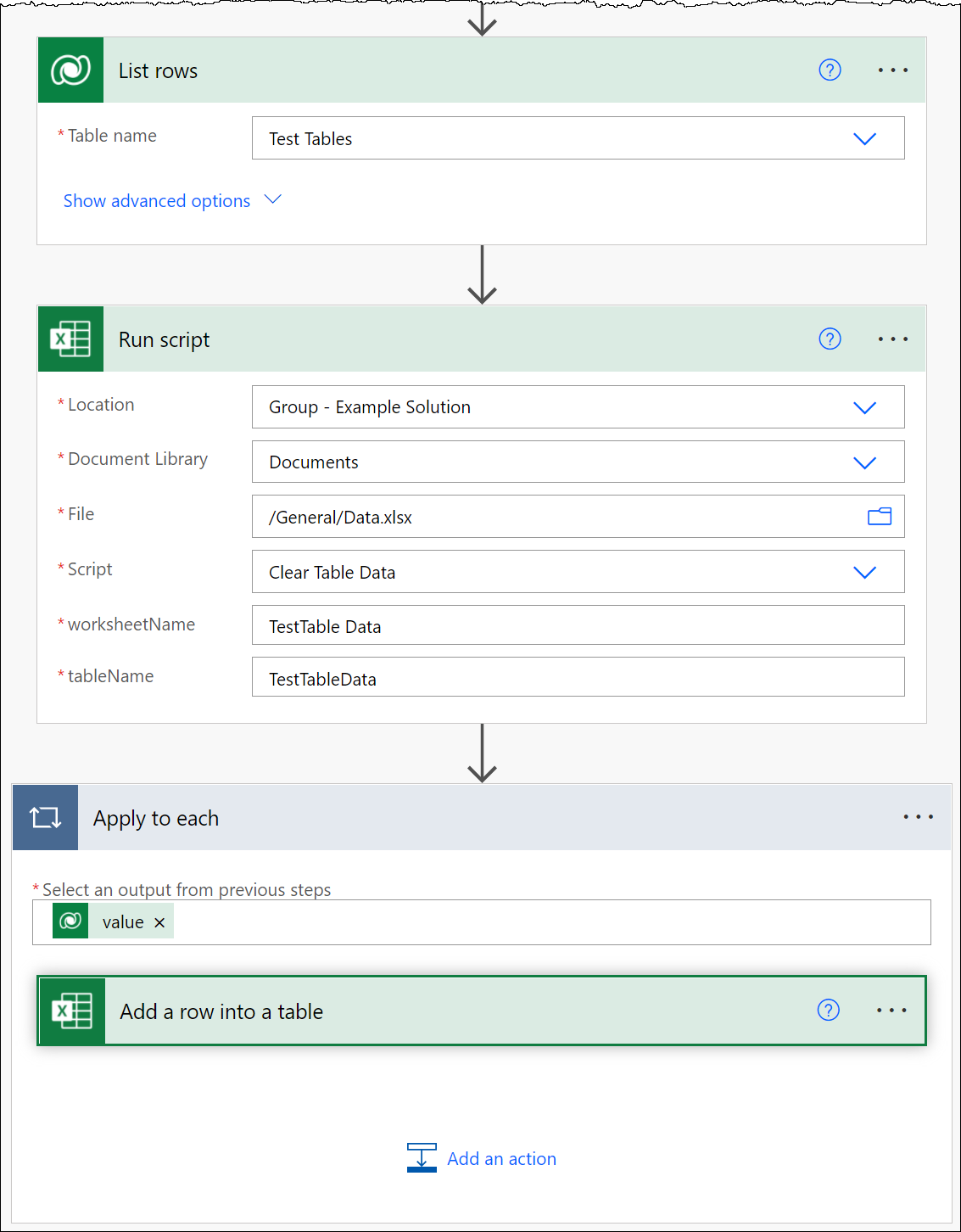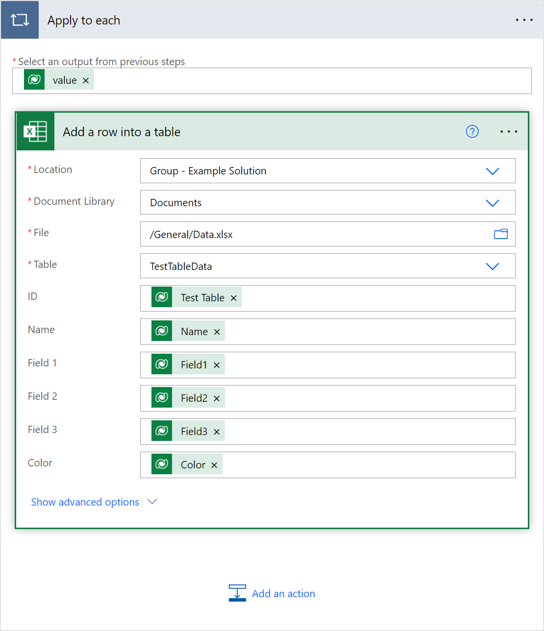 下一步是遍历从表中检索到的数据,并将其写入具有SharePoint表(必须定义为表)的工作区上的Excel文档,其中包含以下字段。