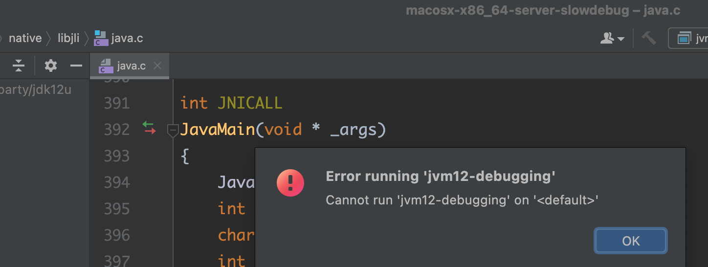 make CONF=macosx-x86_64-server-slowdebug但是,当我开始调试时,CLion显示的错误如下: