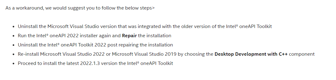 我有VisualStudio2019和2022安装了英特尔的OneAPI工具包之前。它的安装和工作之前完美无缺。当我试图安装一个较新的版本时,我会收到以下错误消息。