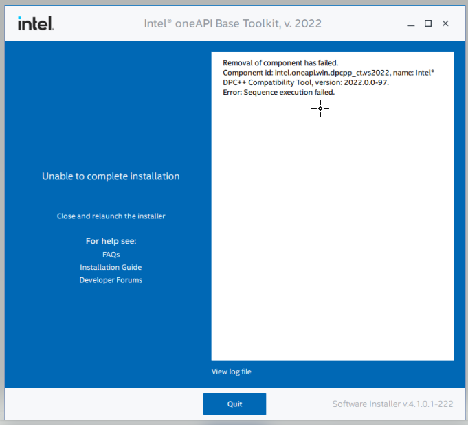 组件移除失败。组件id: intel.oneapi.win.spcpp_st.vs2022,名称:intel DPC++兼容性工具,版本2022.0.0-97.错误:序列执行失败。