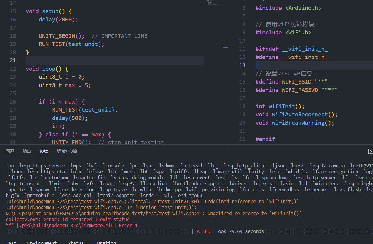 VScode PlatformIO单元测试不能在头文件中使用函数声明,但使用函数定义代码是工作的。它显示了对“`wifiInit()”的未定义的引用