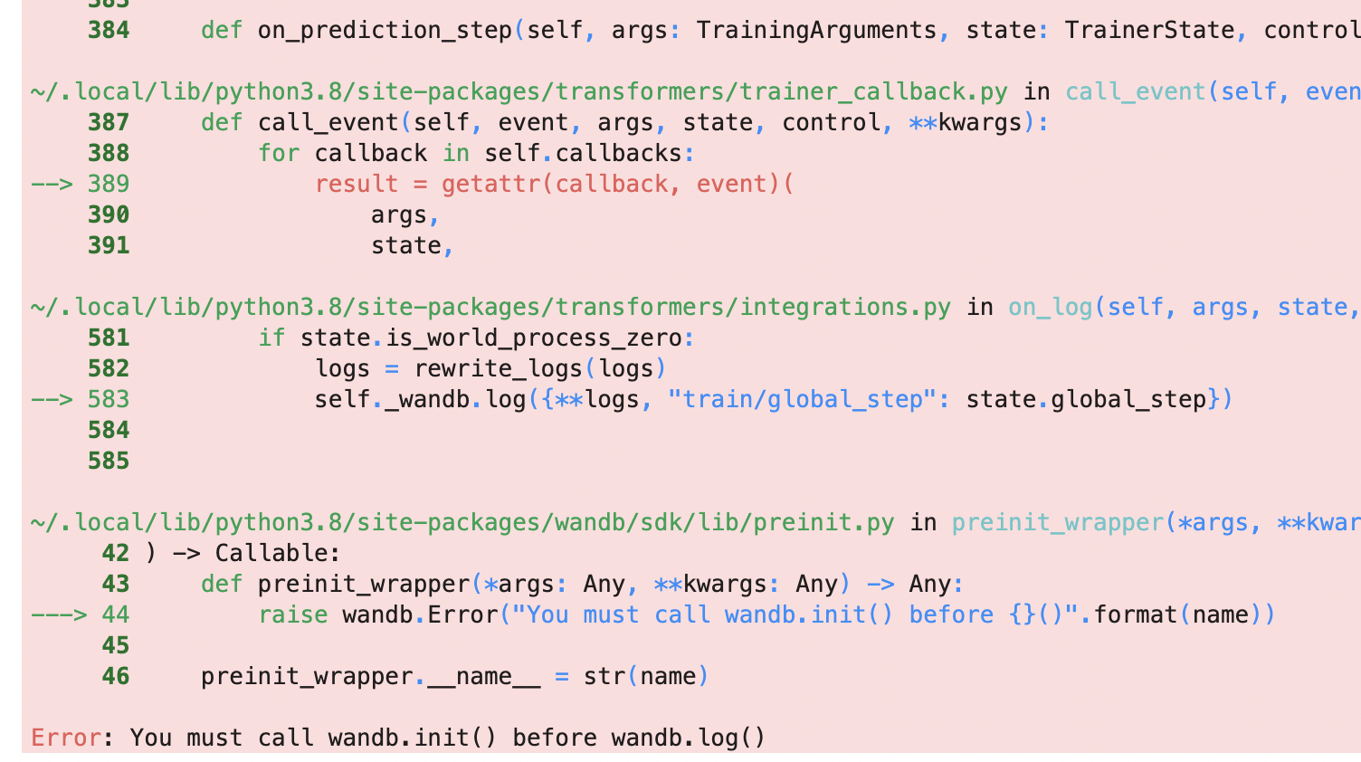 我不明白在哪里叫wandb.log。我甚至尝试过os.environ"WANDB_DISABLED“= "true”,但仍然会遇到错误。请帮帮忙。