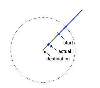 在下面的图片中,我用蓝色大十字标记开始位置,用绿色十字标记目的地。蓝线是通过的轨迹。蓝色小十字表示实际达到的位置,这与绿十字不同。