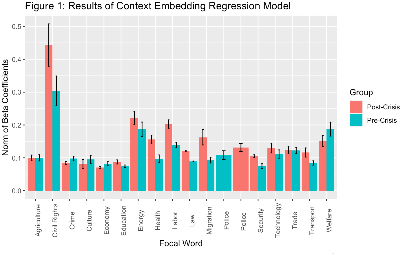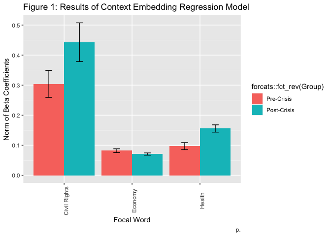 ) + labs(x = "Focal Word", y = "Norm of Beta Coefficients", title = "Figure 1: Results of Context Embedding Regression Model", caption = "p.")