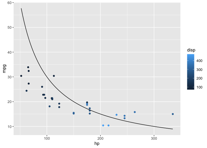ggplot(mtcars, aes(hp, mpg, color = disp)) +
