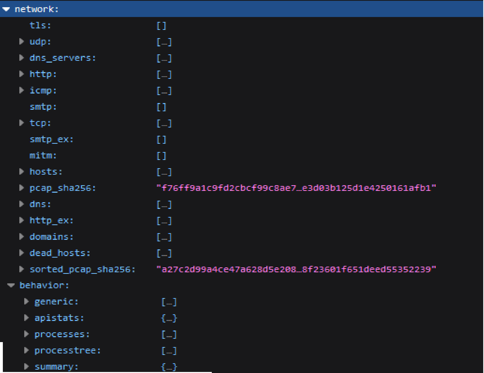 据我所知,“域”、"DNS“、"UDP”、"TCP“、.使用这些协议显示示例的通信。例如,如果恶意软件试图连接到URL,则" DNS“部分中有DNS查询," HTTP”部分中有HTTP查询,“域”部分中有域名," UDP“部分中有"UDP”通信(因为DNS查询通常通过UDP协议),所有这些都与恶意软件试图连接的一个URL相关。