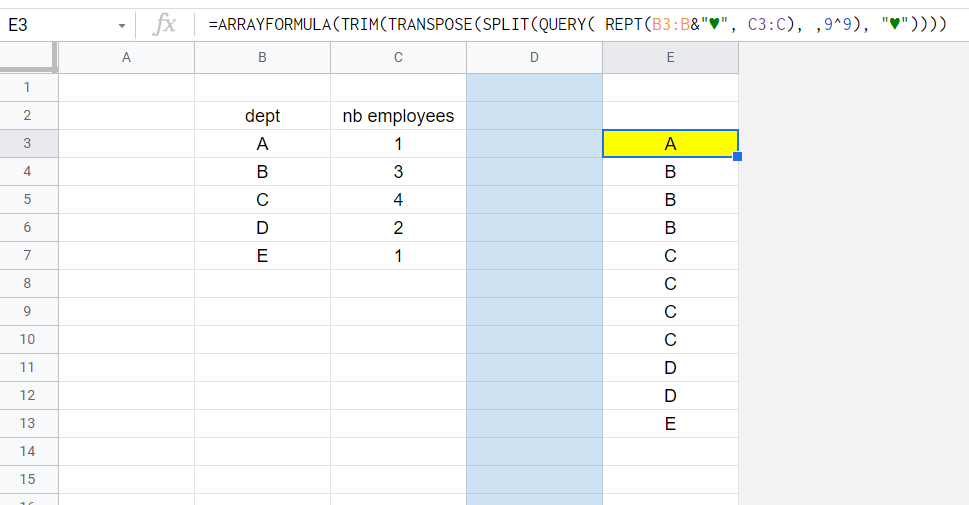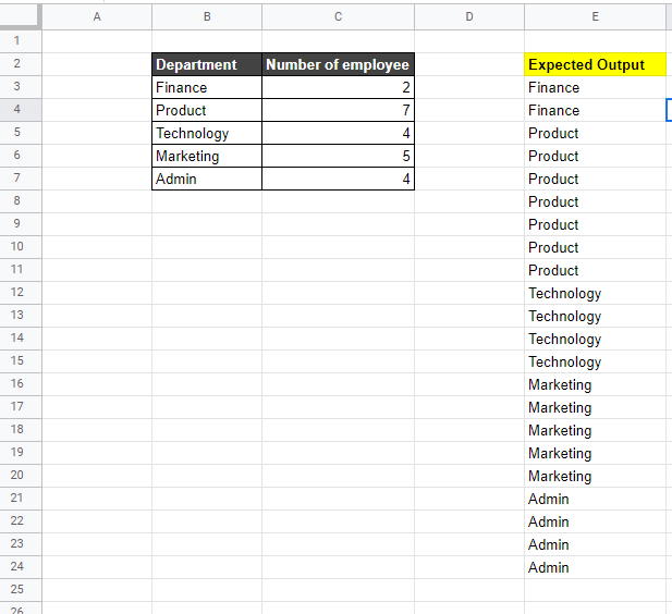我希望使用公式根据部门中的员工人数复制部门名称。例如。财务部有2名员工,所以公式将重复E栏中的2份财务,在产品部有7名员工,那么公式将重复财务下面E栏中的7项产品。列E是我想要实现的预期输出。不确定这是否有可能实现。如有任何帮助或建议,将不胜感激!