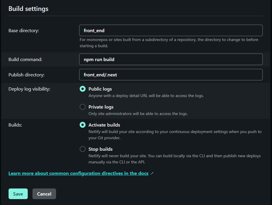 我正试图使用Github将我的Next.js应用部署到Netlify,构建成功了,但是当我打开页面时,它说“找不到页面”。此外,我的回购由两个文件组成: front_end (我的next.js回购处)和back_end (我的可靠智能契约所在)。