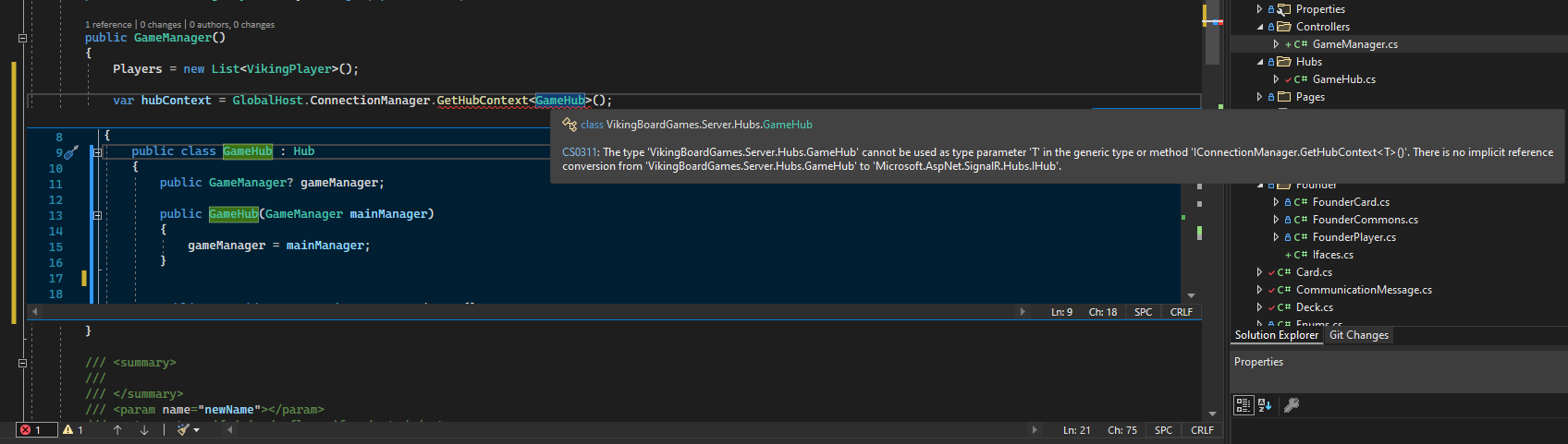 我在承载了SignalR的blazor上创建了一个WASM集线器,我希望能够从GameController发送消息,而不仅仅是从集线器本身发送消息。