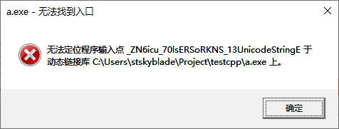 我想在我的class UnicodeString代码中使用icu4c中的c++。我下载了icu4c源代码并对其进行了编译。我用icu4c库编译了我的代码,但是结果.exe文件无法成功执行。如果我在.exe中运行该msys2文件,它就不会输出任何内容。如果我在windows文件资源管理器中双击那个.exe文件,它会显示一个对话框,上面写着"xxx.exe -找不到条目。无法在动态链接库xxx.exe中找到程序入口点xxxxx“。