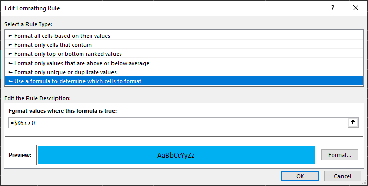 (若要实现条件格式规则,请在带的“主”选项卡上单击“条件格式化->新规则”,您将看到类似于上面的窗口(单击“格式”以定义突出显示样式)