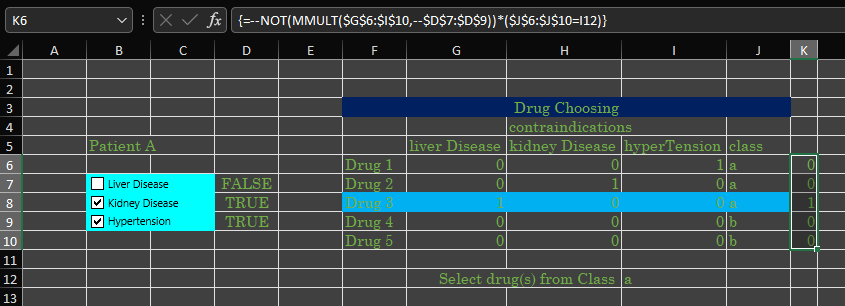 --NOT(MMULT($G$6:$I$10,--$D$7:$D$9))*($J$6:$J$10=I12)如果该行上的药物合适,则返回1,否则返回0。然后将条件格式应用于F6:J10范围,以突出显示合适的药物:
