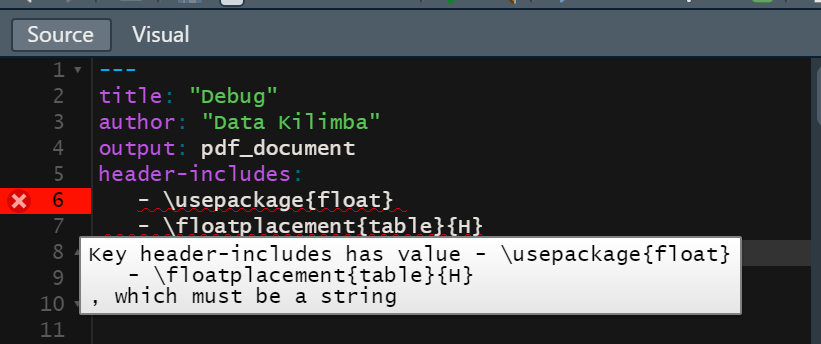 -标题:“Debug”作者:"Data Kalimba“格式: pdf编辑器:可视标题-包括:\usepackage{float} \floatplacement{table}{H} --